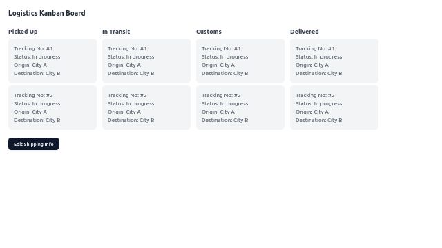 Build an interactive Kanban component for logistics tracking. Each card represents a shipment record showing key details such as tracking number, status, origin, and destination. Each column corresponds to a logistics milestone (e.g., “Picked Up,” “In Transit,” “Customs,” “Delivered”). When a card is moved to the next milestone, open a modal popup prompting the user to fill in additional information (e.g., timestamp, notes, responsible person). Automatically log the time and milestone of every movement for audit and progress tracking. The drag-and-drop interaction should feel effortless and intuitive, with smooth transitions and clear visual feedback. Prioritize a clean, minimal UI that focuses on clarity, readability, and ease of use — suitable for both desktop and tablet views.