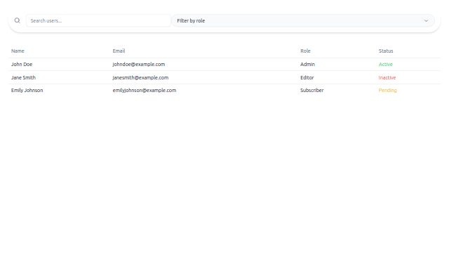 Using headlessui create a capsule with a search box and a filter dropdown. Below that a table of users that can be refined and filtered by the search box and filter dropdown